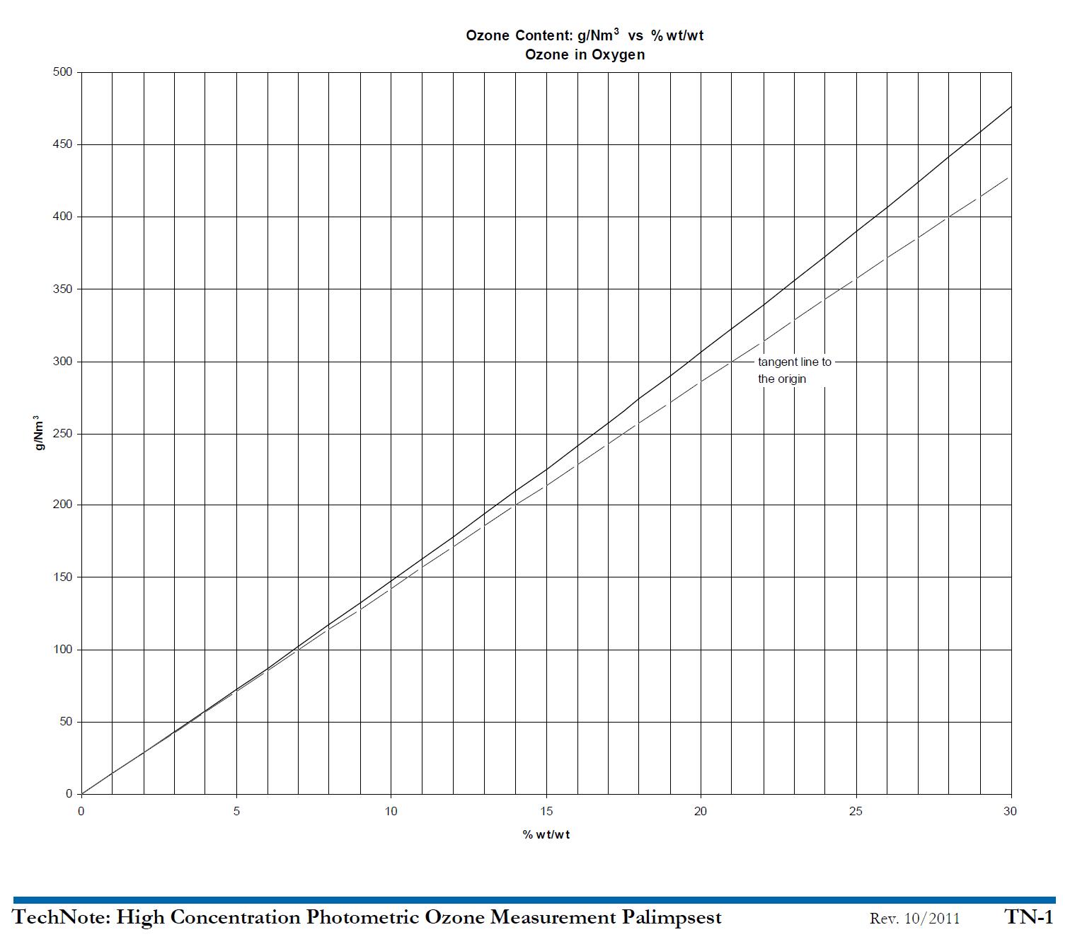 1 Nm3是在0℃和1 atm條件下每立方米所含的樣品氣體的質(zhì)量。這是一個重要的事實,氣體混合物(臭氧和載氣)隨著臭氧含量的變化而改變密度,因為氧(一個氧分子有兩個原子)當(dāng)它轉(zhuǎn)化成臭氧(一個臭氧分子有三個原子)時“收縮”。在商g/Nm3中,分子分母都隨著臭氧含量的變化而變化,使得g/Nm3和% wt/wt之間的關(guān)系是非線性的!