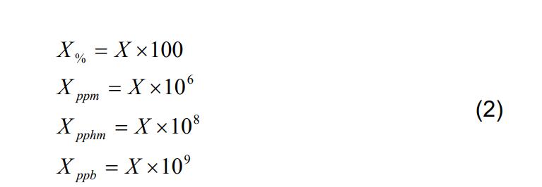 這通常是一個(gè)非常小的數(shù)字,因此混合比通常以百分比、百萬分之幾、億分之幾或十億分之幾(全部按體積,而不是質(zhì)量)表示,如下所示: