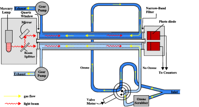 意大利ETG公司的EDK7100P型臭氧分析儀,基于紫外光源的朗伯比爾 Beer-Lambert定律,當254nm紫外光通過臭氧氣體樣品腔室時被臭氧吸收,吸收值與臭氧濃度遵循朗伯比爾定律,通過測量吸收前和吸收后的紫外光信號的變化值,與參考光源進行比對計算,并分析出被測臭氧的濃度值。